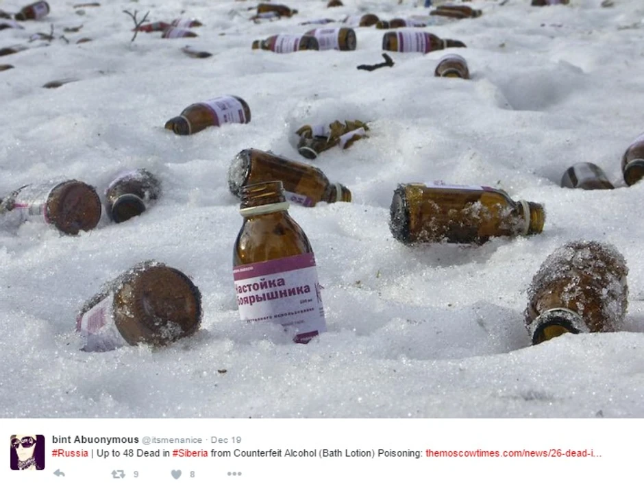 Po poslednjim podacima medicinskih vlasti, 76 osoba je umrlo u Irkutskoj oblasti, u Istočnom Sibiru, od posledica trovanja koncentratom za kupanje "Bojarišnik" (Glog) koji je sadržao 75 odsto metil-alkohola.