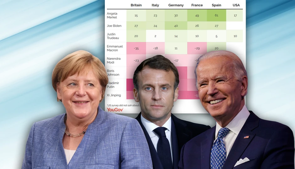 Ono što je anketa YouGov, sprovedena u šest zemalja od 9. jula do 10. avgusta pokazala, je da od svih lidera upravo odlazeća nemačka kancelarka imala najviše pozitivnih ocena. Kako piše britanski "Gardijan" Merkel je pozitivno ocenilo 61 odsto Španaca i 49 odsto Francuza. Začuđujuće, njena popularnost u Nemačkoj je najmanja i iznosi svega 30 odsto.