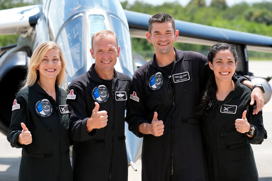 Misija, nazvana “Zora Polarisa”, prva je od tri koje finansira osnivač firme za obradu isplata “Šift4”. On je u brodu kao komandant, zajedno sa svojim bliskim prijateljem Skotom “Kidom” Potitom, penzionisanim pilotom vazduhoplovnih snaga SAD, i dva inženjera “SpejsX-a” Anom Menon i Sarom Gilis.