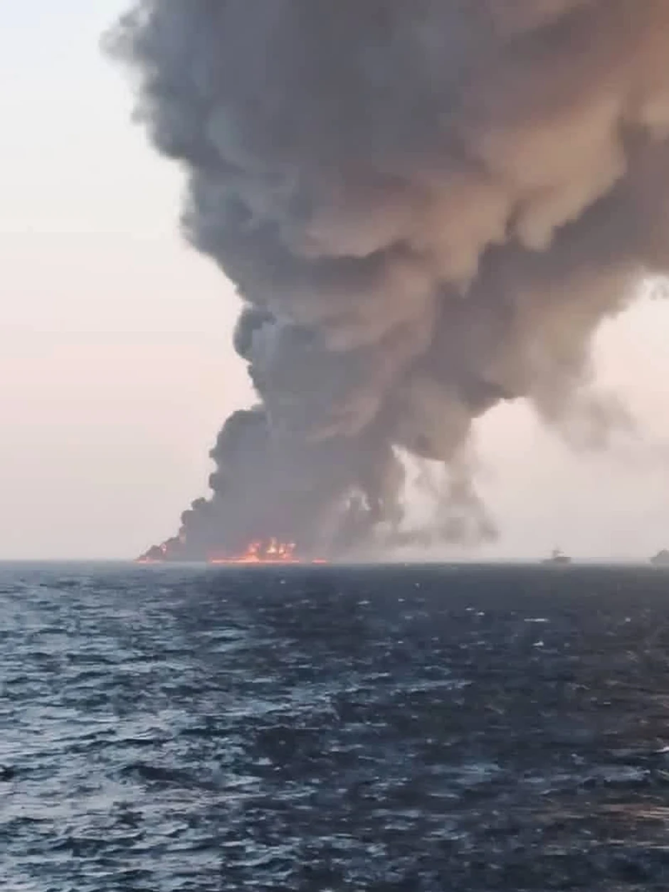 Fotografije koje kruže na iranskim društvenim mrežama prikazuju mornare u prslucima za spasavanje kako napuštaju brod dok vatra gori iza njih.