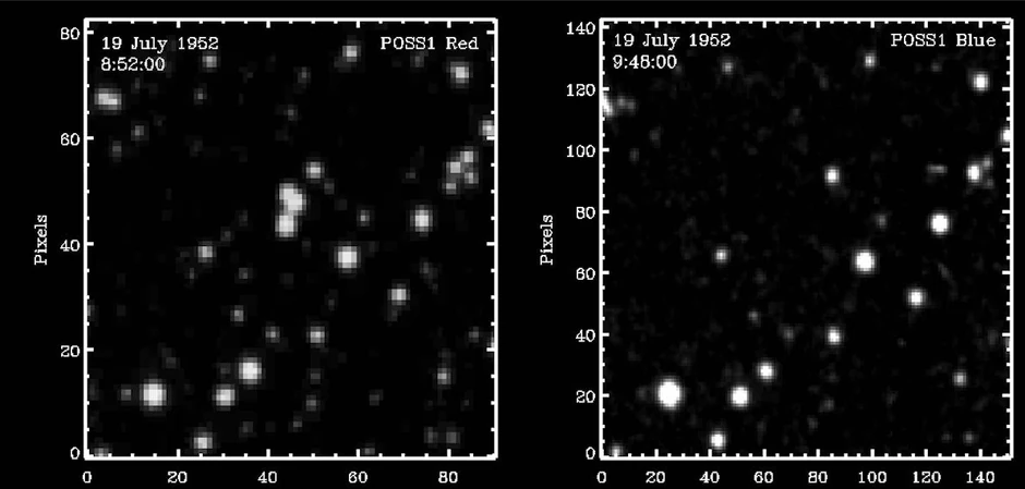 Naučnici u opservatoriji Palomar posmatrali su noćno nebo 19. jula 1952. i kao deo projekta snimili su više fotografija istog područja kako bi pomogli u identifikaciji nebeskih tela kao što su asteroidi. Oko 20:52 snimili su jato od tri sjajne zvezde (magnituda 15), ali kada su isto područje fotografisali u 21:45 - zvezde su nestale. Dakle, za manje od sat vremena od njih nije bilo ni traga.