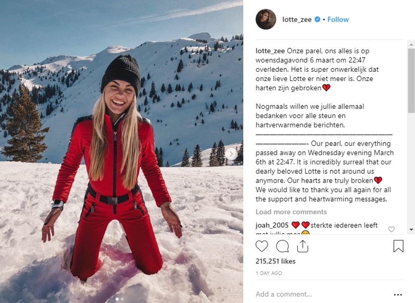 Holanđanka Lote van der Zee (20) iz Enshedea u Holandiji, koja je ponela laskavu titulu najlepše tinejdžerke 2017. godine, naglo se razbolela tokom porodičnog odmora u Vestendorfu, nakon čega joj se stanje pogoršalo. Nju je u besvesnom stanju pronašla njena majka, koja joj je pružila prvu pomoć pre nego što je stiglo medicinsko osoblje koje ju je transportovalo u bolnicu gde je prilikom prijema usanovljeno da je doživela srčani udar.