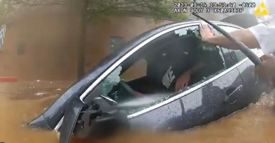 Neverovatna scena spasavanja snimljena je u Atlanti kada su dva policajca ušli u vodu do pojasa i spasili muškarca iz poplavljenog automobila.