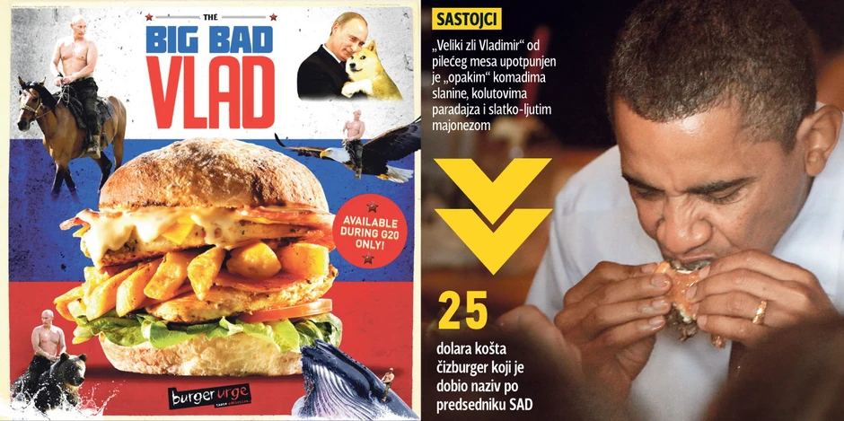 Dva „predsednička“ pileća filea, pomfrit „sečen grubo, u stilu KGB-a“ i list „sibirske“ zelene salate, neki su od sastojaka specijaliteta pod nazivom „Big Bad Vlad“ („veliki zli Vladimir“), koji se može isprobati u restoranu „Burger urdž“.