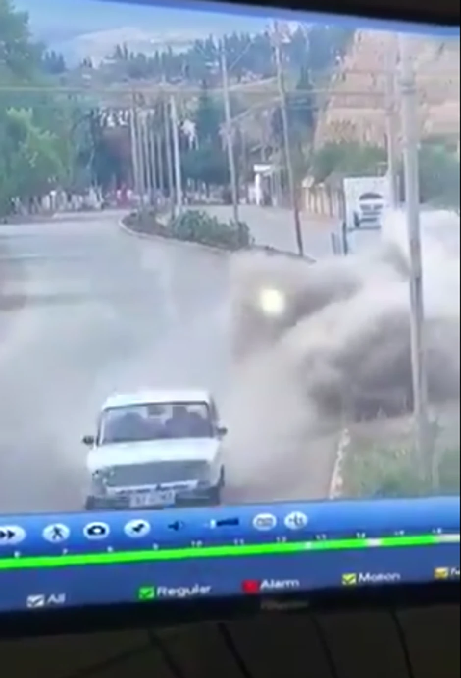 Na snimku se vidi kako sve odleće u vazduh, ali vozač nastavlja da vozi kao da se ništa nije dogodilo, piše "Kurir". Odmah potom još jedan projektil udara, i pravi rupu na putu, ali je "lada" već daleko.