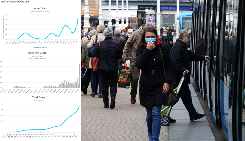 Projekcije doktora Ozrena Polašeka sa Medicinskog fakulteta u Splitu, koji je član Naučnog saveta Vlade RH, pokazuju da će, ako se ništa ne promi, brojke početi da strmoglavo skaču. Za dve nedelje ukupni broj aktivnih slučajeva porašće na 9.000, a broj hospitalizovanih na 1.000, što je granice preko koje zdravtvu preti kolaps.