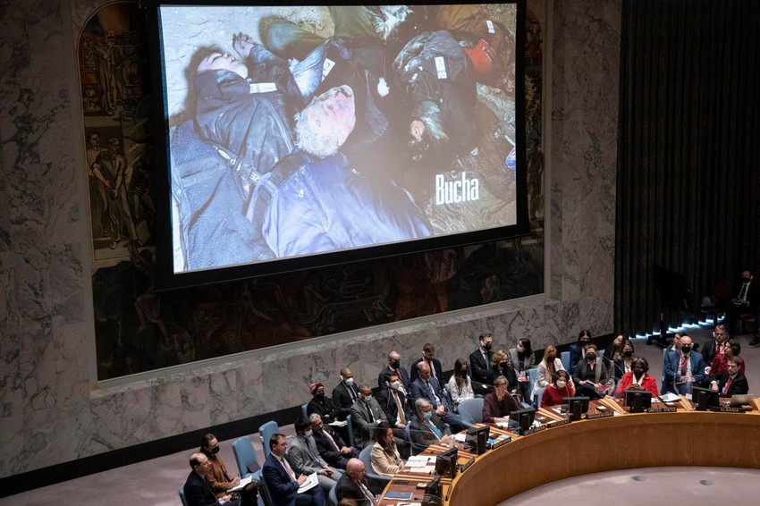 Veliki deo diplomatskog rata odvijao se u nejasnim sporovima oko protokola UN. Nakon izveštaja o navodnim ruskim zločinima u gradu Buča u Ukrajini, ruska misija pri Ujedinjenim nacijama pozvala je na hitan sastanak Saveta bezbednosti UN, verovatno da bi pokušala da okrivi Ukrajinu za pogubljenja ukrajinskih civila. Do sastanka nikada nije došlo.