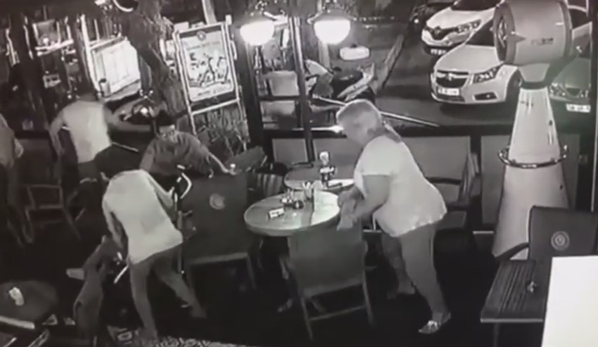 U trenutku kada se zemljotres počinje, svi gosti lokala, mešu kojima su i majka i beba, trče prema vratima, ne birajući način da ih se dokopa. U tom haosu, saplitali su se o kolica u kome je bilo dete, sve dok jedan dovoljno priseban muškarac nije zabrinutoj majki pritrčao u pomoć i pridržao kolica.