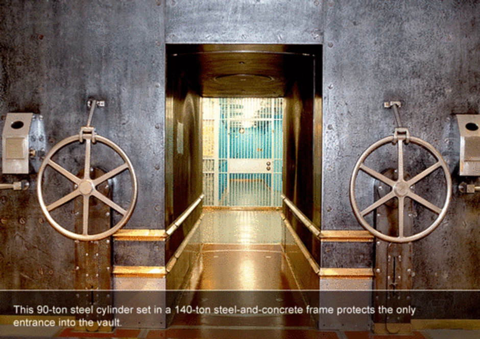 Zidovi su debeli oko jedan metar, vrata trezora visoka skoro tri metra. Imaju čelični ram od 140 tona i cilindar od 90 tona. Vrata se automatski hermetički zatvaraju, pa osoba koja ostane unutra ima dovoljno kiseonika da preživi 72 sata.