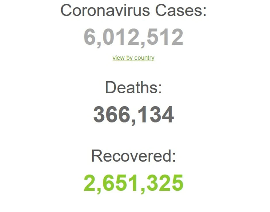 Kako se navodi na sajtu, korona virusom zaraženo je 6.012.512 ljudi, 366.134 je preminulo, a 2.651.325 je izlečeno.