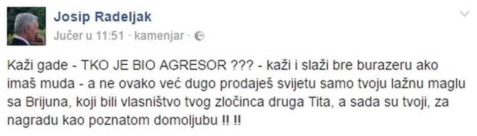 "Kaži gade - ko je bio agresor?! Kaži i slaži bre burazeru ako imaš m**a, a ne ovako već dugo prodaješ svetu svoju lažnu maglu s Briona koji su bili vlasništvo tvog zločinca druga Tita, a sada su tvoji, za nagradu kao poznatom domoljubu - ražestio se Radeljak na Fejsbuku, prenosi hrvatski portal "Index.hr".