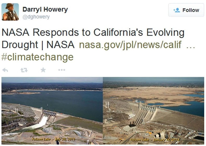 Tim NASA naučnika koristio je satelite za klimatska proučavanja i otkrili su da su korita reka Sakramento i San Hoakin na 41.6 triliona litara ispod normalnog sezonskog nivoa. Ovaj nagli pad postao je primetan od 2002. godine.