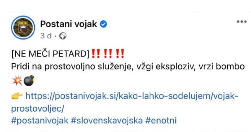 "Ne bacaj petarde! Prijavi se na dobrovoljno služenje vojske, upali eksploziv i baci bombu" bila je poruka objavljena na Fejsbuk profilu vojske, a skinuta je s društvenih mreža jutros.