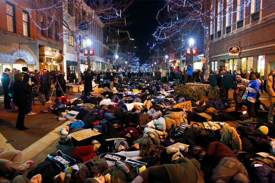 Oko 65 demonstranata je u predgradju Njujorka leglo na ulicu u znak protesta. Među njima su bili Džejson Voker iz Atlante, koji je u došao u Njujork na venčanje, kao i njegova trogodišnja ćerka Džejdin.