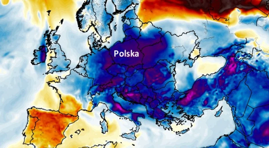 Na mapi temperaturnih anomalija, Evropa je pretežno obojena plavom i ljubičastom bojom, što ukazuje na ozbiljan pad temperature.