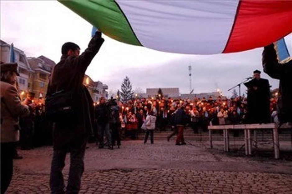 Demonstranti pevaju mađarsku himnu u znak protesta zbog toga što je Marius Popice, prefekt županije (načelnik okruga koji je u međuvremenu smenjen) novčano Mađarsku građansku stranku (MPP). Popice je kaznio MPP zbog toga što je na stranačkom skupu otpevana mađarska himna a nije intornirana himna Rumunije.