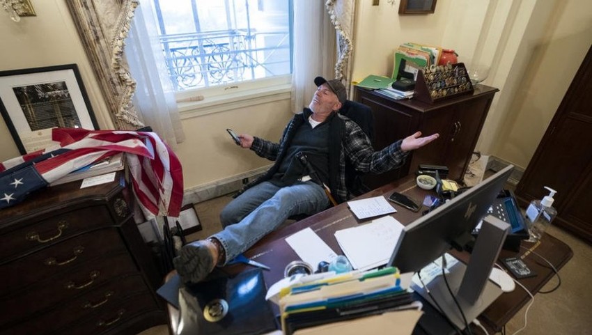 - Ušli smo, ušli smo, Derok Evans je u Kapitolu...našoj kući! - kaže u videu koji je snimio mobilnim telefonom, objavio na Tviteru pa kasnije obrisao. Čuje se i kako druge demonstrante poziva da ništa ne uništavaju te kako policajcu govori: -Gospodine, Bog vas blagoslovio, ništa lično. Kasnije je za sebe rekao kako je "nezavisni pripadnik medija koji je tamo bio kako bi snimio istoriju".