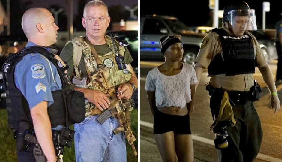 Dve fotografije nastale tokom protesta koji se u američkom gradu Fergusonu odigrao prošlog vikenda još više su pojačale tenzije među belcima i crncima. Na jednoj fotografiji vidi se kako policija bez problema hapsi crnkinju, a na drugoj, nastaloj gotovo u isto vreme, nalazi se belac koji slobodno šeta sa automatskom puškom u rukama.