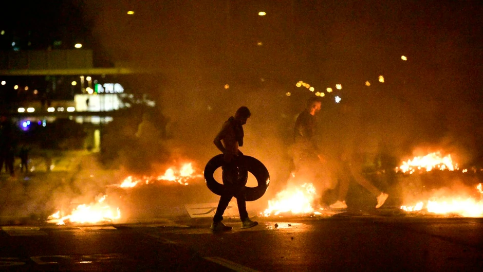 Pobunjenici su šipkama od polomljenih saobraćajnih znakova razlupali autobuska stajališta, a zatim su kamenje i baklje bacali na policajce. Dalje niz put, automobili, gume i kante za smeće bili su zapaljeni.