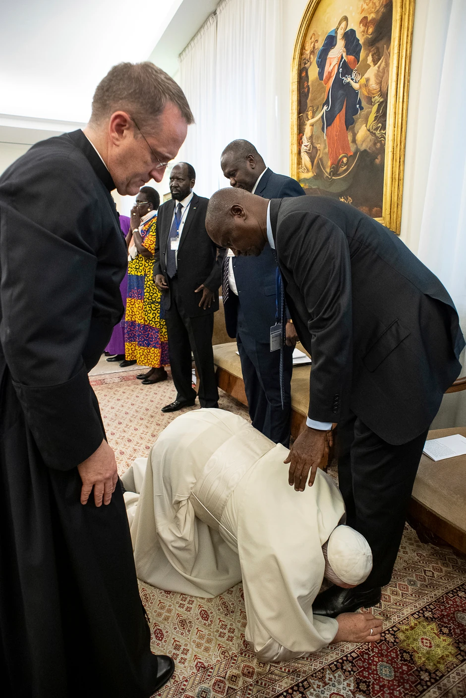 Kako prenosi britanska agencija, na zaprepašćenje južnosudanskih lidera 82-godišnji papa, kleknuo je uz pomoć svojih saradnika kako bi poljubio cipele dva glavna protivnika i nekoliko drugih ljudi u sobi. Vatikan je danas okupio vođe Južnog Sudana u papinoj rezidenciji u pokušaju da tokom 24-časovne molitve zaleče gorke podele, mesec dana pre nego što je predviđeno da se u ratom razorenoj zemlji formira vlada nacionalnog jedinstva. Kako dodaje britanska agencija, papin gest je učinjen u kontekstu napetosti zbog državnog udara u susednom Sudanu, koji bi mogao potkopati nestabilni mirovni sporazum koji je okončao petogodišnji građanski rat u Južnom Sudanu.