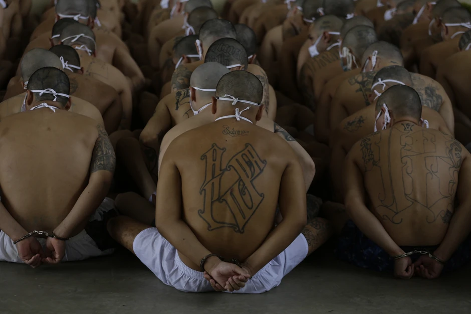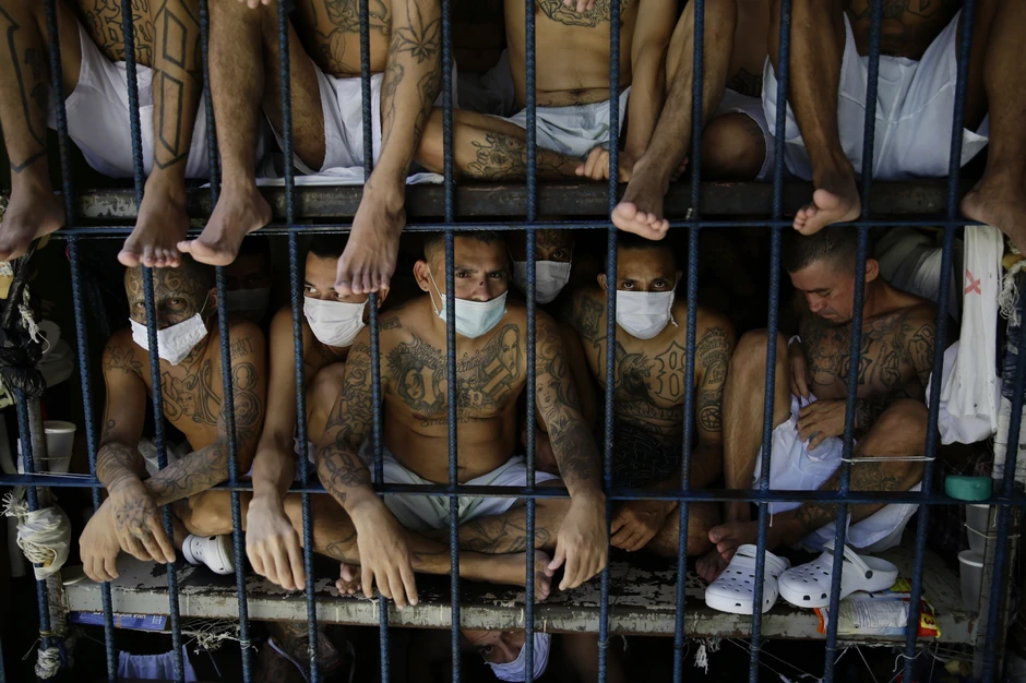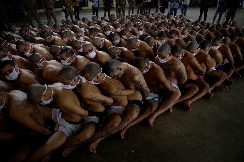 Članovi ozloglašenih salvadorskih bandi “Mara Salvatruča” (MS-13) i “Bario 18”, koje šire strah i trepet u Južnoj Kaliforniji i odgovorni su za veliki broj surovih ubistava, snimljeni su u četvrtog septembra u visokoobezbeđenim zatvorima u Salvadoru dok su čekali da budu pretreseni. Zbijeni kao sardine sedeli su s lisicama na rukama samo u donjem vešu i s maskama na licu, jedinom zaštitom od pandemije korona virusa.