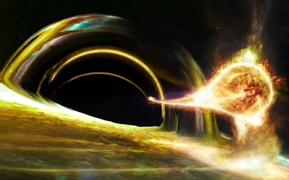 Polovina zvezde biva “progutana” od strane crne rupe, dok druga polovina biva izbačena napolje. Kada materijal pada u crnu rupu, to se dešava na kružni način, slično kao kad voda odlazi kroz odvod u kadi.