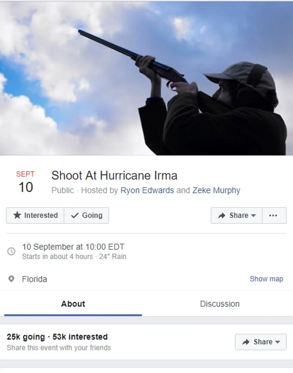 Policija se oglasila nakon što je na Fejsbuku veliku popularnost stekao događaj, odnosno poziv da se puca na uragan Irmu.