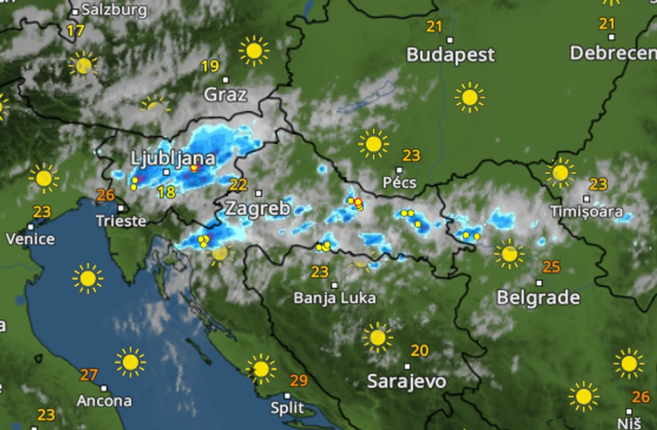 Vreme u Dalmaciji danas će biti pretežno sunčano i vruće, dok će u ostalim krajevima biti promenljivo oblačno i nestabilno, uz kišu ili pljuskove s grmljavinom, koji lokalno mogu biti izraženiji.