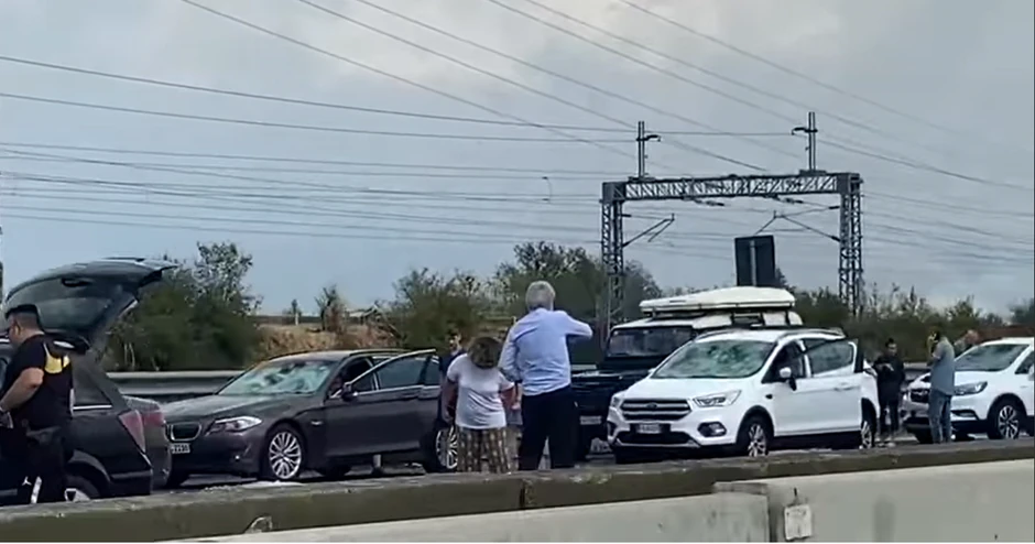 Na snimku se vide automobili sa polupanim šoferšajbnama i putnici koji u čudu stoje pored svojih uništenih četvorotočkaša.