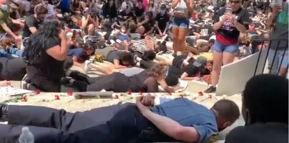 Bilo je slučajeva kada su pripadnici policije kleknuli pred demonstrantima i učestvovali u protestima, ali je reteko da neko od njih legne na zemlju.