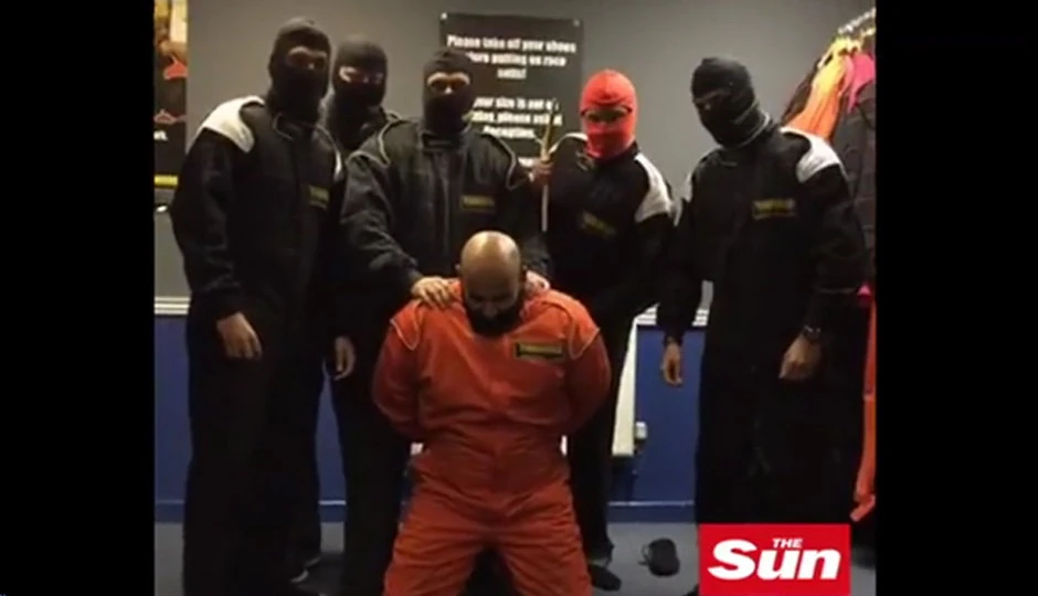 Video, koji je završio na internetu, prikazuje pet muškaraca u crnim kombinezonima i sa maramama, kako se smeju dok stoje iznad kolege azijskog porekla. Azijat, koji se u video zove Saf Ahmed kleči u narandžastom kombinezonu, kakav inače oblače taocima koje je zarobila Islamska država.