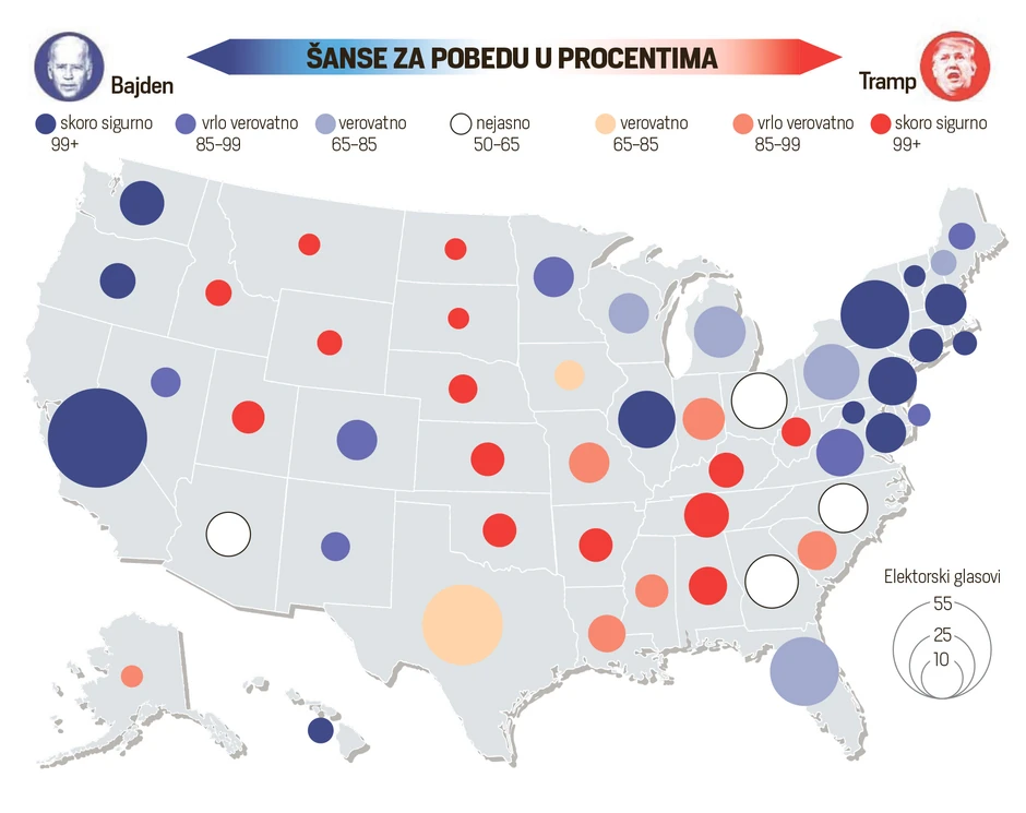 Do vrlo sličnih rezultata došao je "Ekonomist". Projekcija ovog sajta, koja se zasniva na kombinovanju nacionalnih anketa i političko-ekonomskim faktorima u svakoj državi ponaosob, pokazuje da Bajden ima više od 85 odsto šansi da pobedi na glasanju elektora. Nasuprot njemu, Tramp ima oko 14 odsto.