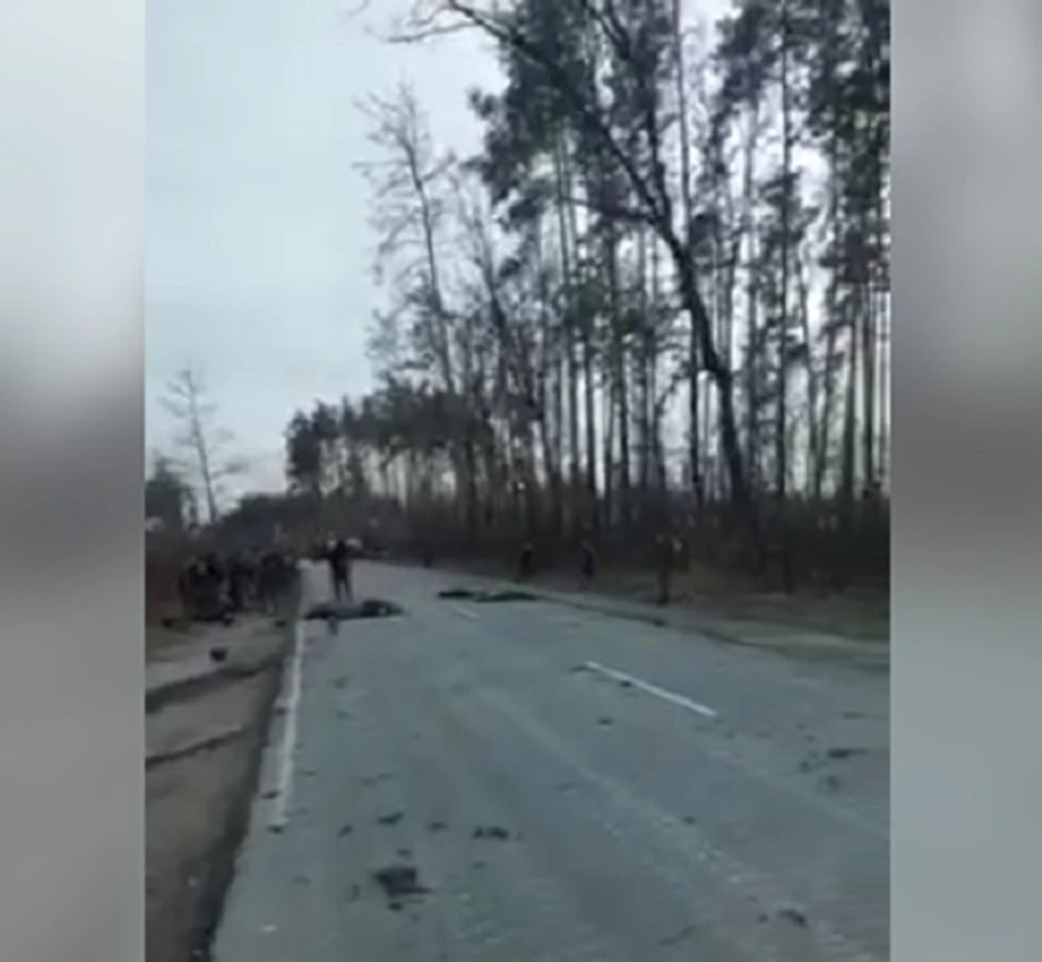 U blizini se može videti nekoliko tela, verovatno ubijenih, a kako navodi "Njujork tajms", snimak je od 30. marta kada su Ukrajinci na tom mestu iz zasede napali ruski konvoj, prenosi TASS.
