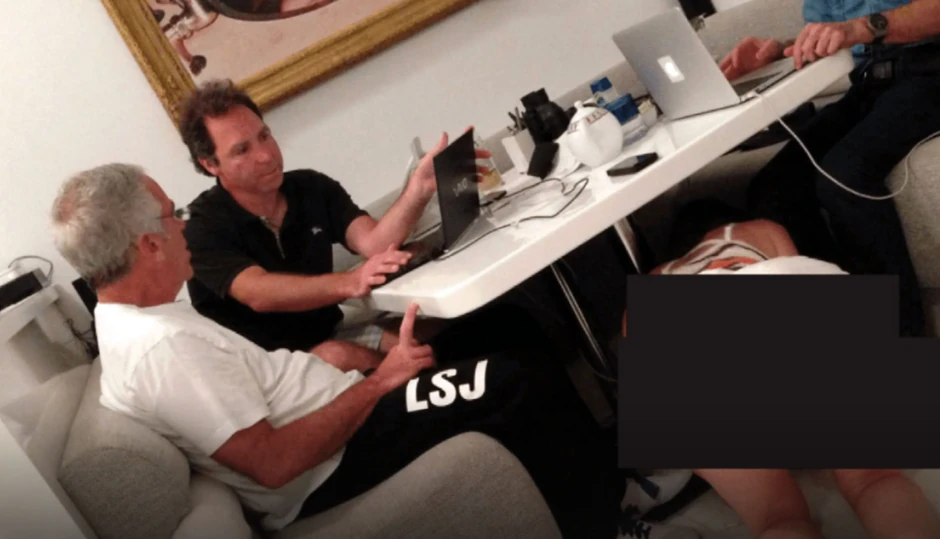 Džefri Epstajn i još dvojica muškaraca ponašaju se kao da je reč o potpuno uobičajenom poslovnom sastanku - sede za stolom, dok se ispod njihovih nogu nalazi žena u bikiniju.