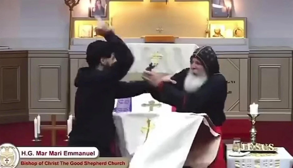 Episkop Mar Mari Emanuel iz crkve Asirskog Hrista Dobrog Pastira govorio je tokom večernje službe u ponedeljak kada mu je muškarac prišao držeći nož, kako se vidi na snimcima sa događaja.