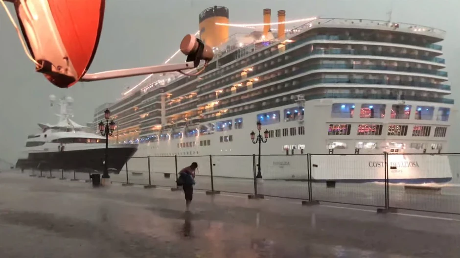 Kruzer “Kosta Deliziosa” napuštao je luku Venecije u nedelju kad su ga zahvatili snažni vetrovi i grad.