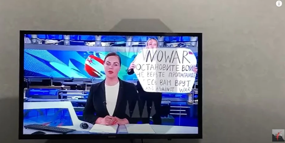 Urednica državne ruske televizije Kanal 1 Marina Ovsjanikova, uletela je danas u kadar tokom emitovanja vesti iza koleginice koja je vodila dnevnik držeći u rukama transparent protiv rata koji Rusi vode u Ukrajini.