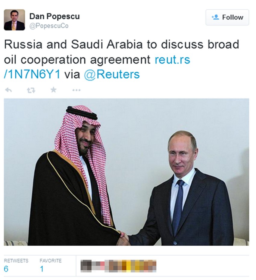 Prošlog meseca Rusija i Saudijska Arabija potpisale su brojne kooperativne dogovore uključujući i memorandum o razumevanje na ekonomskom forumu u Sankt Peterburgu. Saudijski princ Mohemd bin Salman Al Saud susreo se sa ruskim predsednikom Vladimirom Putinom što će igrati veliki ulogu u novonastalom partnerstvu dveju država.