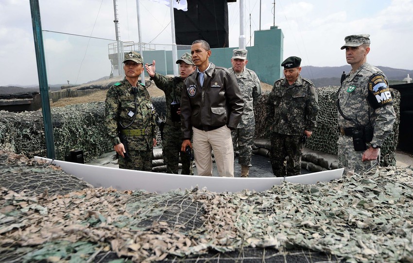 Oko 28.500 američkih vojnika stacionirano je u Južnoj Koreji. Američki predsednik je zatim ušao na jako obezbeđenu ničiju zemlju da obiđe mali izviđački punkt gde južnorejske snage patroliraju na samo 100 metara od demarkacione linije.