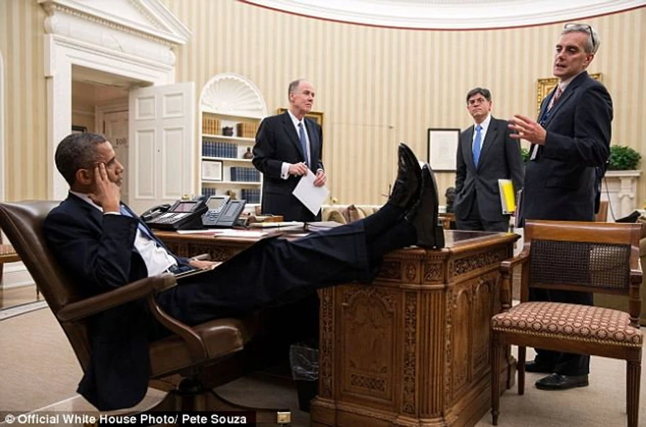 Barak Obama, predsednik SAD, od dolaska na vlast 2008. godine u javnosti gaji imidž opuštene osobe, a sudeći po zvaničnim fotografijama iz Bele kuće koje je objavio modni magazin "Veniti fer", njegova opuštenost ide do toga da on maltene ne skida noge sa stola koji je britanska kraljica Viktorija 1880. poklonila Raderfordu Hejsu, tadašnjem američkom predsedniku.