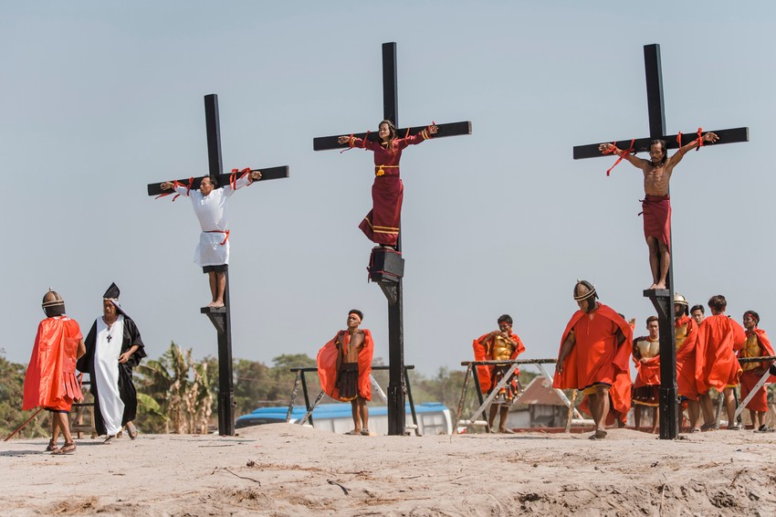 Četvoricu muškaraca i jednu ženu, od kojih su neki nosili krune od grančica, pratili su meštani obučeni kao rimski centurioni, a ovih petoro ljudi bilo je prikovano na krsteve kako bi obeležili Veliki petak.