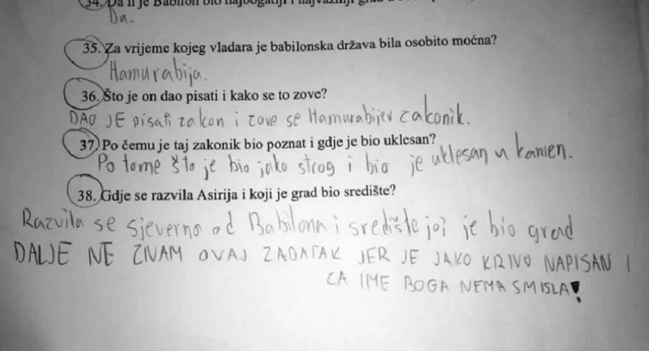 Čitateljka hrvatskog N1 portala poslala je fotografiju testa iz istorije koji je iznervirao njenog sina, a kojim se testiralo znanje petaka o detaljima iz života drevne Mesopotamije.
