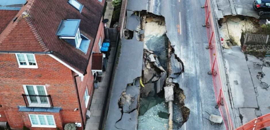 Ljudi napuštaju svoje domove nakon što se na glavnoj ulici Sarija u Engleskoj otvorila ogromna rupa. Vlasti su isključile snabdevanje vodom u selu Godstoun nakon što je rupa prečnika 20 metara progutala vrt.