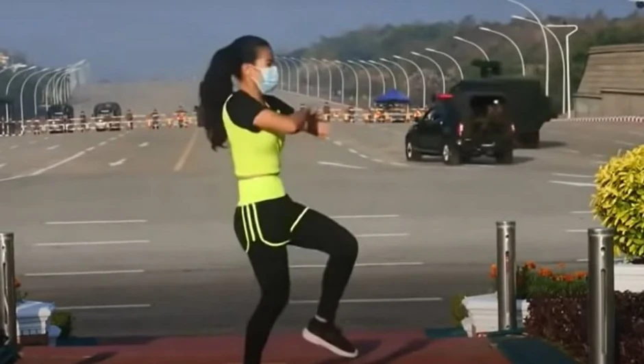 U snimku koji je postao viralan, vidi se kako ona nesvesna svega što se dešava bezbrižno nastavlja da vežba dok vojska zauzima zgradu i hapsi političare te zemlje, uključujući i predsednicu vladajuće Nacionalne lige za demokratiju Aung San Su Ći.