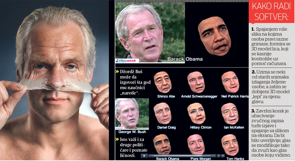 Međutim, zabrinjavajuća je činjenica da uz samo nekoliko klikova mišem možemo bilo kome na svetu da stavimo u usta koju god izjavu poželimo, i to bez ikakvog znanja „žrtve“. Dovoljno je da sami snimimo škakljivu izjavu i povežemo je s odabranim licem.