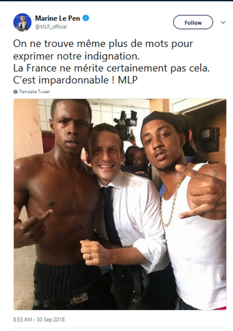 Fotografija je je snimljena prilikom Makronove posete karipskom ostrvu Sveti Martin, koje delimično pripada Francuskoj. Predsednik je posetio ostrvo godinu dana nakon što je tamo besneo uragan "Irma". Tom prilikom se slikao s dvojicom tamnoputih mladića, od kojih je jedan go do pasa i pokazuje srednji prst.