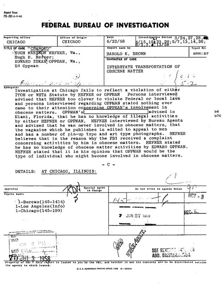 Dosije sadrži i dopis upućen tadašnjem direktoru FBI-ja Džonu Edgaru Huveru u kojem agent zadužen za Hefnerov slučaj predlaže da osnivač "Plejboja" i njegov fotograf Edvard Opman budu stavljeni pod nadzor da bi se utvrdilo da li krše zakon, tačnije da li prenose "pornografske snimke" preko granica saveznih država.