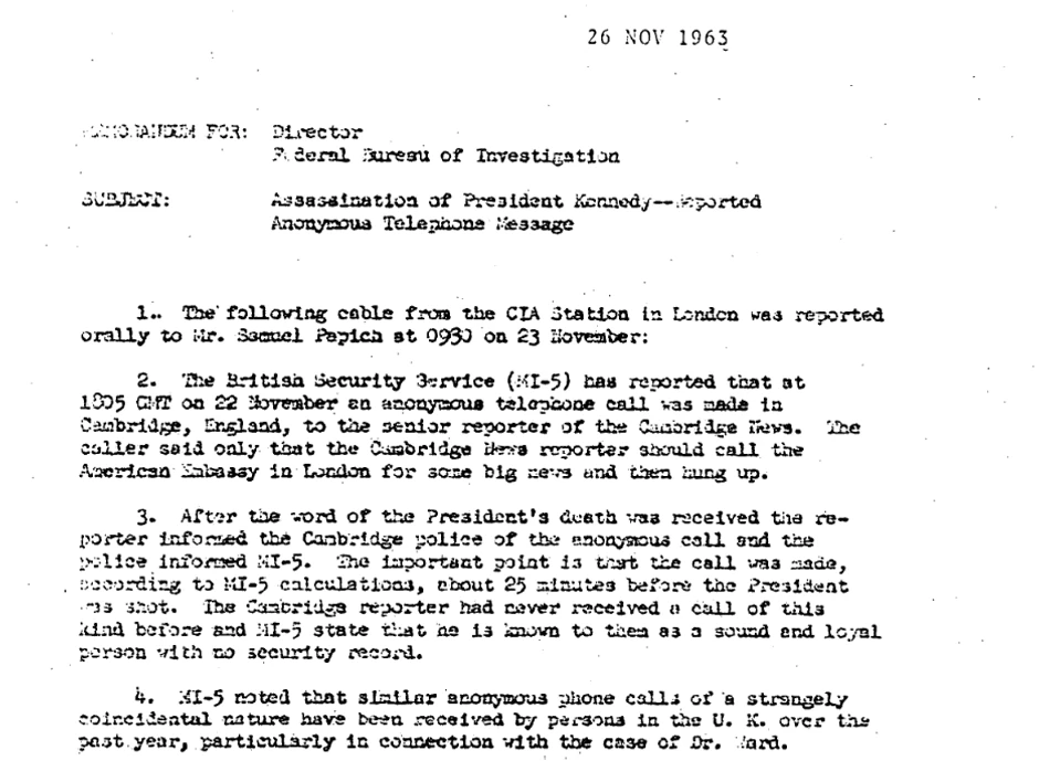 - Novinar britanskog lista "Kembridž ivning njuz" dobio je anonimni poziv 25 minuta pre ubistva Kenedija, u kojem mu je rečeno da pozove američku ambasadu u Londonu zbog velikih vesti i da pričeka.