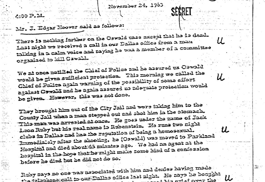 - FBI je upozorio policiju Dalasa da se Liju Harviju Osvaldu preti smrću, stoji u dokumentu koji potpisuje sam direktor FBI, Džej Edgar Huver. "Sinoć smo primili poziv pod čoveka koji je mirnim glasom rekao da je član grupe koja je organizovana da ubije Osvalda", piše u dokumentu.