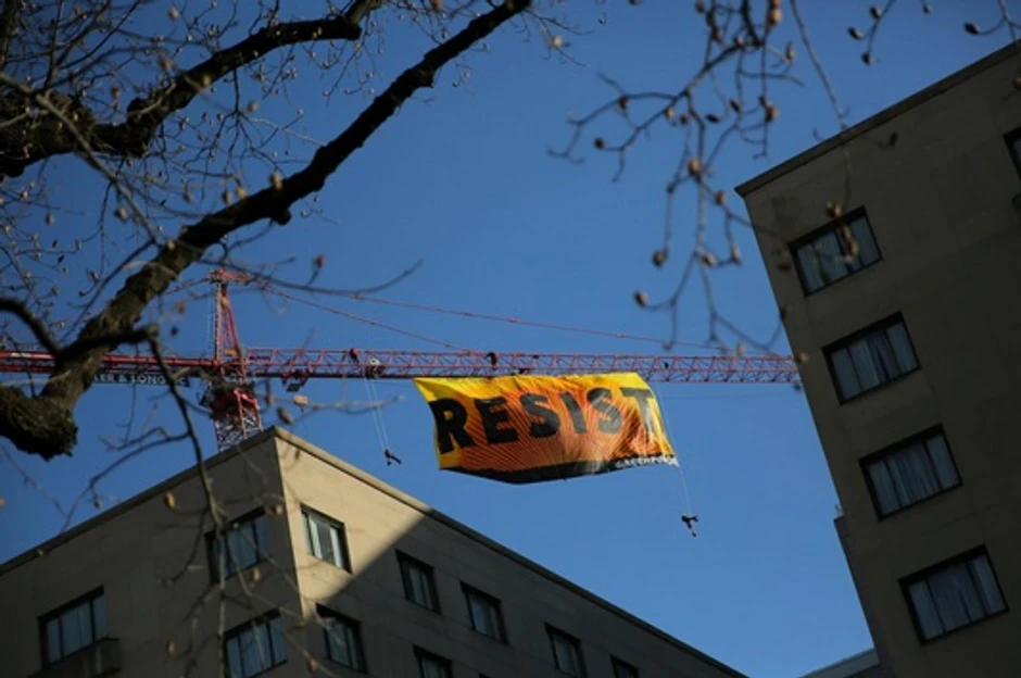 Sedam aktivista ekološke organizacije Grinpis popelo se na kran jednog gradilišta u Vašingtonu, nedaleko od Bele kuće u znak protesta protiv novog predsednika SAD Donalda Trampa, i ne dozvoljava radnicima da nastave posao.